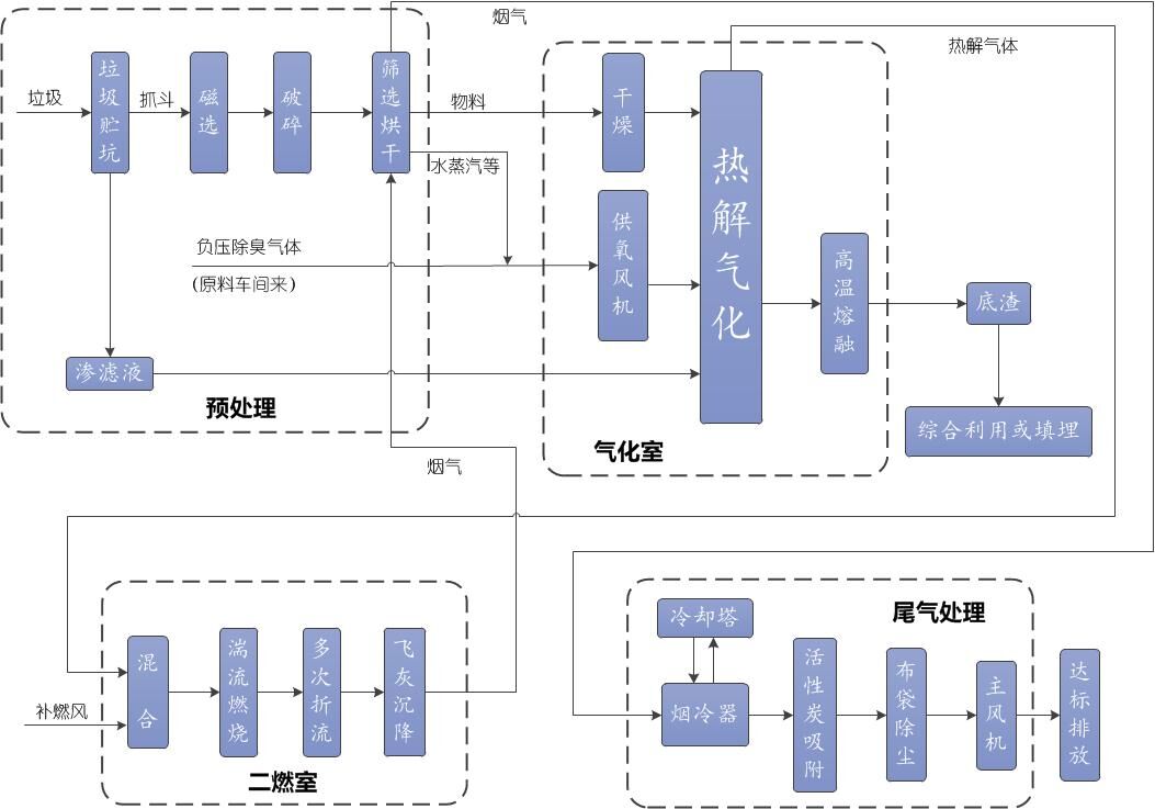 将中低温气化、高温燃烧和除尘措施有机统一在设备内部,采用系统化整体设计,实现设备高度集成、小型化、且占地面积小。